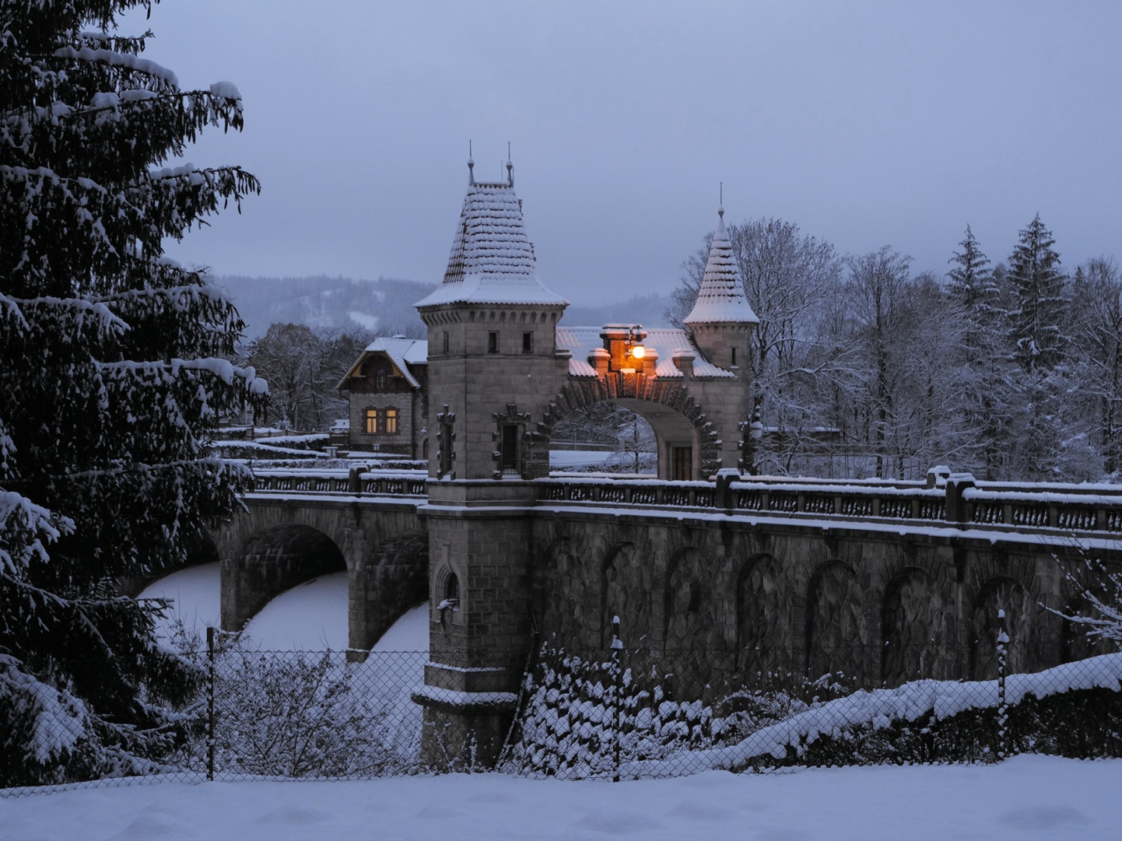 Zasněžená přehrada Les Království v noci a ráno